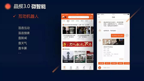 “除了大家熟悉的內(nèi)容算法智能推薦,我們還為晶報(bào)APP3.0增加了語(yǔ)音聯(lián)播、互動(dòng)機(jī)器人等功能,讓用戶(hù)不用動(dòng)手指,僅通過(guò)語(yǔ)音就能搜索內(nèi)容,與晶報(bào)互動(dòng)?!?/p>